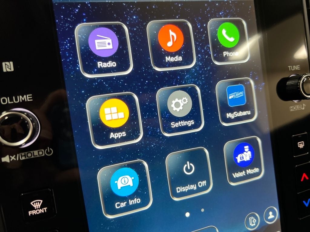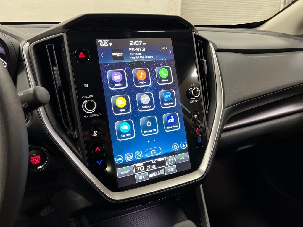 - Radio: Subaru 11.6" Multimedia Plus System -inc: valet mode, AM/FM stereo, HD Radio, multi-touch gesture high resolution display screen, voice activated controls, Bluetooth® audio streaming and hands-free phone connectivity, Bluetooth® hands-free SMS text messaging connectivity, iPod control capability, smartphone integration: wired and wireless Android Auto w/full screen view, wireless Apple CarPlay w/full screen view and wireless connection, USB and Over The Air (OTA) audio system update, audio system and Bluetooth® steering wheel control switches, 6 speakers (2 dash panel tweeter, 2 front door, 2 rear door), illuminated 3.5mm auxiliary input jack, illuminated USB A and C input charge ports, roof mounted satellite and connected services, roof mounted black antenna, connected services operation indicator, SOS emergency assistance (red button) and ehanced roadside assistance (blue i-button)