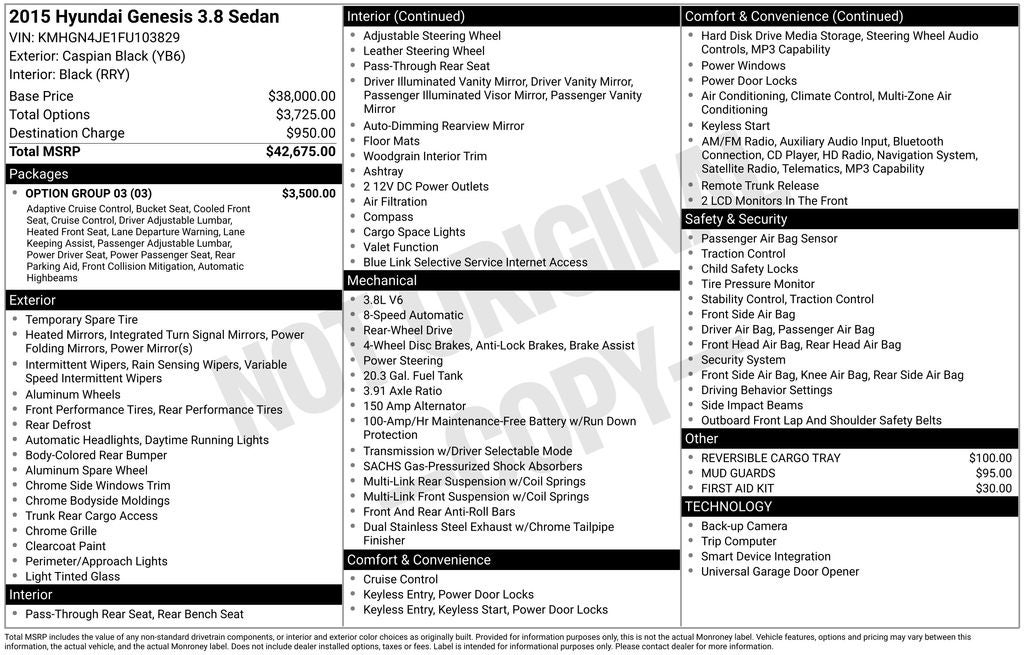 2015 Hyundai Genesis Caspian Black 3.8 RWD 8-Speed Automatic with SHIFTRONIC 3.8L V6 DGI DOHC Dual CVVT Black w/Ultra-Premium Leather Seating Surfaces, 7 TFT LCD Cluster Display, Air Conditioning, Auto-Dimming Outside Mirrors, Automatic Emergency Braking (AEB), Blind Spot Detection System, Electronic Parking Brake w/Automatic Vehicle Hold, Exterior Parking Camera Rear, Front & Rear Parking Assistance System, Haptic Feedback Steering Wheel, HID Headlights w/Auto-Leveling, High Beam Assist, Integrated Memory System (IMS), Lane Departure Warning System (LDWS), Lane Keep Assist, Leather Seating Surfaces, Navigation System, Option Group 02, Parking Guidelines, Power driver seat, Power Heated & Cooled Front Bucket Seats, Power Heated/Cooled Front Bucket Seats, Power passenger seat, Power Rear Sunshade, Power Tilt-and-Slide Panoramic Sunroof, Power Tilt-and-Telescopic Steering Wheel, Pre-Safe® ty Seatbelt, Radio: AM/FM/HD/SiriusXM/CD/DVD/MP3 Audio System, Remote keyless entry, Signature Package 02, Smart Cruise Control, Technology Package 03, Turn signal indicator mirrors, Ultra-Premium Leather Seating Surfaces, Wheels: 18 x 8.0J Machine Finished Aluminum Alloy. Recent Arrival! 18/29 City/Highway MPG * You will love our NO HAGGLE, NO HASSLE PRICING here at Fitzgerald Auto Mall. Ask us about our BUYER PROTECTION PLAN, LOANER CAR PROGRAMS, AND FREE Vehicle History Report ** COMES WITH A WRITTEN FITZWAY CHECKOUT COVERING ALL MAJOR ITEMS! ALL FITZGERALD PRICES ARE REAL PRICES WITH NO SNEAKY PRICE CONDITIONS OR ADDITIONAL RECONDITIONING OR CERTIFICATION CHARGES! No Added Market Adjustments or Hidden Fees! Transparency You Can Trust, That's The FitzWay! Transparency You Can Trust.