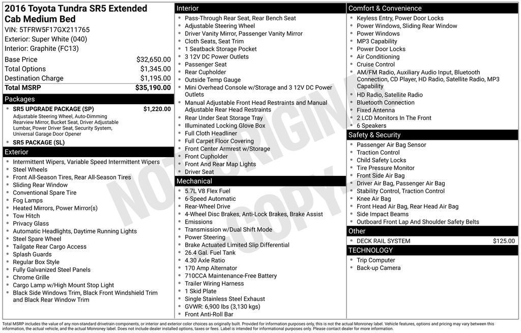 Super White 2016 Toyota Tundra SR5 RWD 6-Speed Automatic Electronic with Overdrive i-Force 5.7L V8 Flex Fuel DOHC 32V LEV Graphite Cloth, 38 Gallon Fuel Tank Capacity, 4.30 Axle Ratio, AM/FM radio: SiriusXM, Anti-Theft Immobilizer w/Alarm, Compass, Electrochromic Rear-View Mirror, Front Bucket Seats, Front Center Armrest w/Storage, HomeLink Universal Transceiver, SR5 Upgrade Package, Urethane Tilt/Telescopic 4-Spoke Steering Wheel.