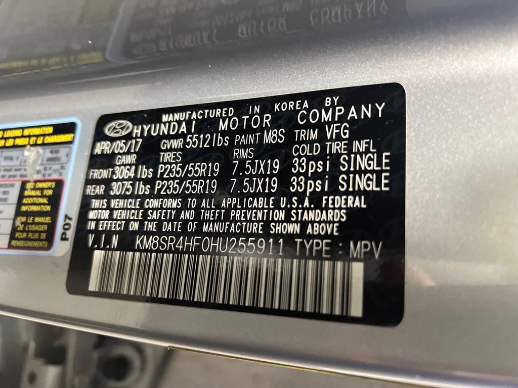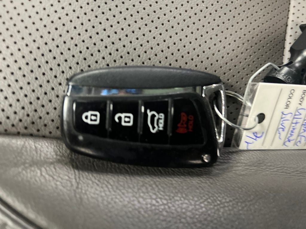 ** MOONROOF ** 2017 Hyundai Santa Fe Circuit Silver Limited Ultimate FWD 6-Speed Automatic with Shiftronic 3.3L V6 DGI DOHC 24V Gray Leather, 12 Speakers, 19 x 7.5J Aluminum Alloy Wheels, 3.041 Axle Ratio, 3rd row seats: split-bench, 4-Wheel Disc Brakes, ABS brakes, Air Conditioning, Alloy wheels, AM/FM radio: SiriusXM, Android Auto, Auto-dimming Rear-View mirror, Automatic temperature control, Brake assist, Bumper Applique, Bumpers: body-color, Cargo Cover, Cargo Net, Cargo Tray, Carpeted Floor Mats, CD player, Compass, Delay-off headlights, Driver door bin, Driver vanity mirror, Dual front impact airbags, Dual front side impact airbags, Electronic Stability Control, Emergency communication system: Blue Link, Exterior Parking Camera Rear, First Aid Kit, Four wheel independent suspension, Front anti-roll bar, Front Bucket Seats, Front Center Armrest, Front dual zone A/C, Front fog lights, Front reading lights, Fully automatic headlights, Garage door transmitter: HomeLink, Heated & Ventilated Multi-Adjustable Bucket Seats, Heated door mirrors, Heated front seats, Heated rear seats, Heated steering wheel, Illuminated entry, Knee airbag, Leather Seating Surfaces, Leather steering wheel, Low tire pressure warning, Memory seat, Mudguards, Navigation System, Occupant sensing airbag, Outside temperature display, Overhead airbag, Overhead console, Panic alarm, Passenger door bin, Passenger vanity mirror, Power door mirrors, Power driver seat, Power Liftgate, Power moonroof, Power passenger seat, Power steering, Power windows, Radio: AM/FM/SiriusXM/CD/HD/MP3 w/Navigation, Rear air conditioning, Rear anti-roll bar, Rear Parking Sensors, Rear window defroster, Rear window wiper, Remote keyless entry, Roof rack: rails only, Security system, Speed control, Speed-sensing steering, Split folding rear seat, Spoiler, Steering wheel mounted audio controls, Tachometer, Telescoping steering wheel, Tilt steering wheel, Traction control, Trip computer, Turn signal indicator mirrors, Variably intermittent wipers, Ventilated front seats.