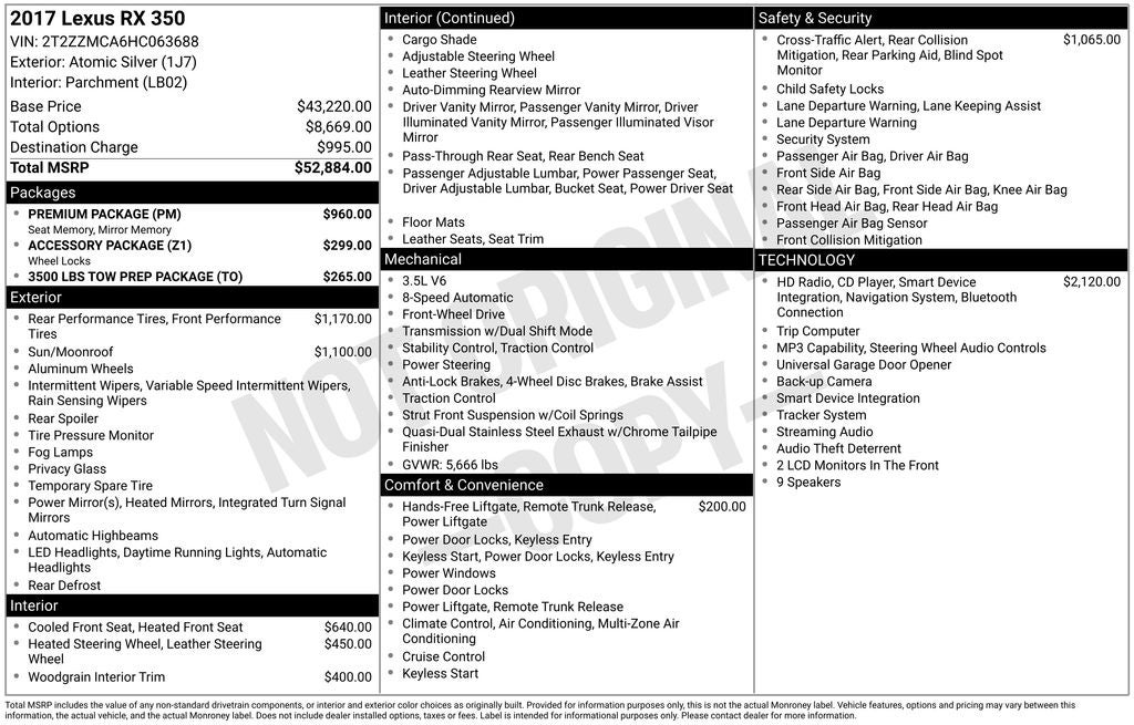 2017 Lexus RX Atomic Silver 350 FWD 8-Speed Automatic 3.5L V6 DOHC 24V Parchment w/Leather Seat Trim, 12.3 Navigation System, 3500 lbs Tow Prep Package, 9 Speakers, Air Conditioning, Aluminum Roof Rails, AM/FM radio: SiriusXM, Auto-dimming Rear-View mirror, Automatic temperature control, Backup Monitor, Blind Spot Monitor w/Rear Cross Traffic Alert, CD player, Delay-off headlights, Driver Seat/Steering/Mirror Memory - 3 Settings, Exterior Parking Camera Rear, Four wheel independent suspension, Front Bucket Seats, Front dual zone A/C, Front fog lights, Heavy Duty Alternator, Heavy-Duty Radiator, Leather Seat Trim, Lexus Enform App Suite, Lexus Enform Destinations, NuLuxe Seat Trim, Outside temperature display, Passenger door bin, Power driver seat, Power Liftgate, Power passenger seat, Power steering, Power Tilt & Slide Moonroof, Power windows, Premium Package, Radio data system, Radio: AM/FM/CD Lexus Display Audio, Rear Armrest Storage Compartment, Rear seat center armrest, Rear window defroster, Remote keyless entry, Single-Disc DVD Changer, Speed-sensing steering, Steering wheel mounted audio controls, Traction control, Transmission Cooler, Turn signal indicator mirrors, Wheels: 20 x 8 Split 5-Spoke Dark Silver.