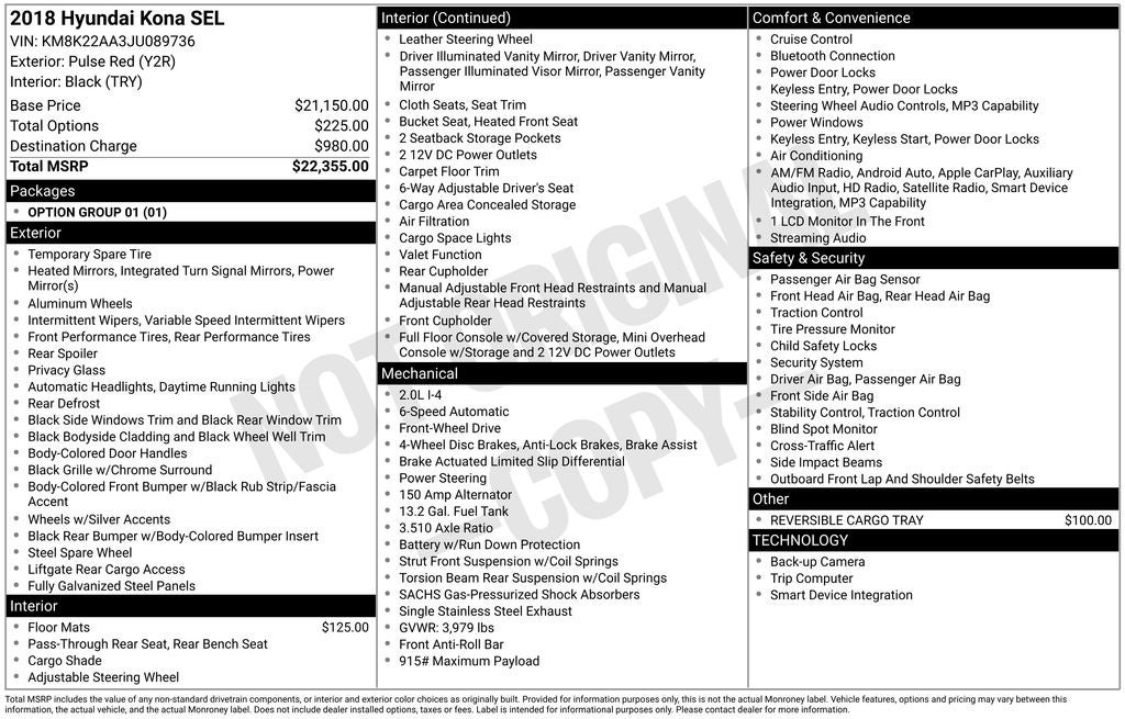 ** ONE OWNER ** 2018 Hyundai Kona Pulse Red SEL FWD 6-Speed Automatic I4 17 x 7.0 Alloy Wheels, 6-Way Adjustable Driver's Seat, Air Conditioning, Apple CarPlay & Android Auto, Cloth Seat Trim, Exterior Parking Camera Rear, Front Bucket Seats, Fully automatic headlights, Heated Front Bucket Seats, Outside temperature display, Radio: AM/FM/HD Radio/SiriusXM Audio System, Remote keyless entry, Speed control.