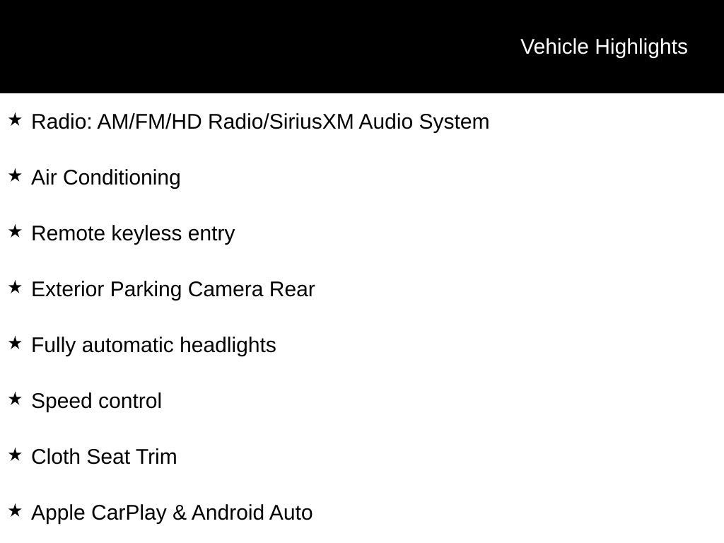 - Radio: AM/FM/HD Radio/SiriusXM Audio System -inc: 7" LCD touchscreen display, 6 speakers, Android Auto, Apple CarPlay, Siri and Google Now support, USB/aux input jack and voice recognition
