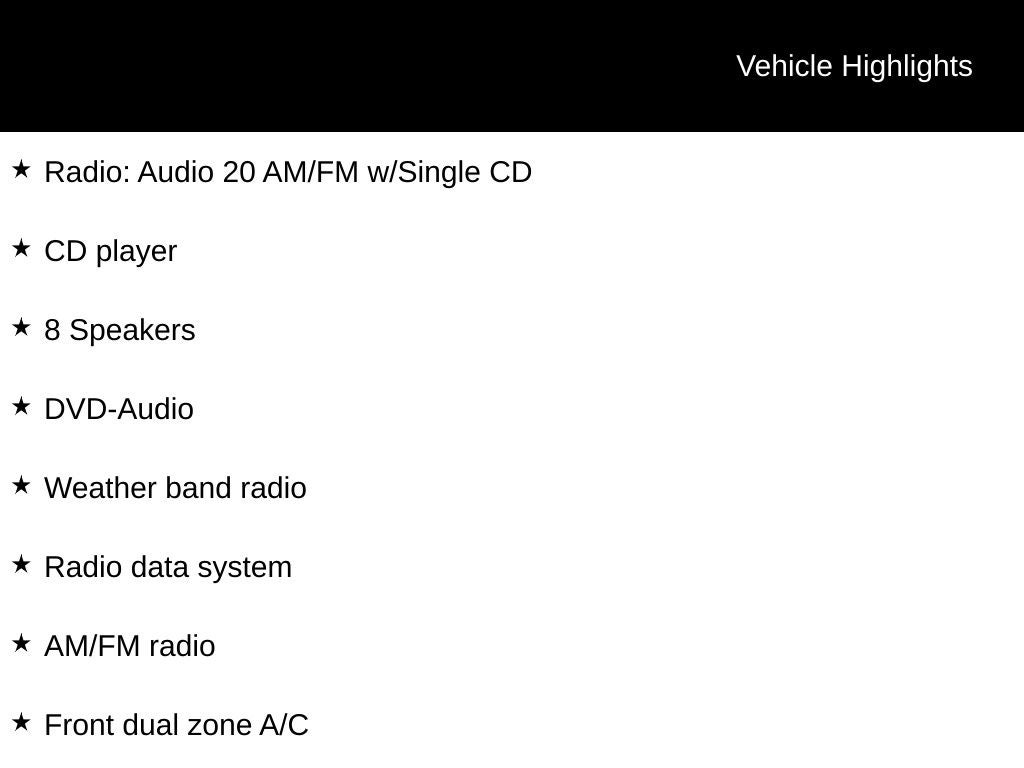 - Radio w/Seek-Scan, MP3 Player, Clock, Speed Compensated Volume Control, Aux Audio Input Jack, Steering Wheel Controls, Voice Activation, Radio Data System, Weatherband, DVD-Audio and External Memory Control
