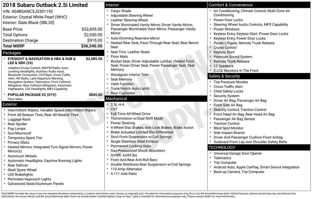 2018 Subaru Outback Crystal White Pearl 2.5i Limited AWD CVT Lineartronic 2.5L 4-Cylinder DOHC 16V 12 Speakers, Active Cruise Control, Alloy wheels, Anti-whiplash front head restraints, Apple CarPlay/Android Auto, Auto-dimming Rear-View mirror, Automatic temperature control, Brake assist, CD player, Compass, Driver door bin, Driver vanity mirror, Electronic Stability Control, Exterior Parking Camera Rear, Front anti-roll bar, Front dual zone A/C, Fully automatic headlights, Garage door transmitter, harman/kardon Surround Sound Speaker System, Heated door mirrors, Heated Reclining Front Bucket Seats, Illuminated entry, Leather Shift Knob, Low tire pressure warning, Memory seat, Outside temperature display, Panic alarm, Passenger vanity mirror, Perforated Leather-Trimmed Upholstery, Power Liftgate, Power moonroof, Rear window wiper, Remote keyless entry, Security system, Smartphone Integration, Steering wheel mounted audio controls, Steering Wheel Paddle Shift Control Switches, Telescoping steering wheel, Tilt steering wheel, Turn signal indicator mirrors, Variably intermittent wipers.
