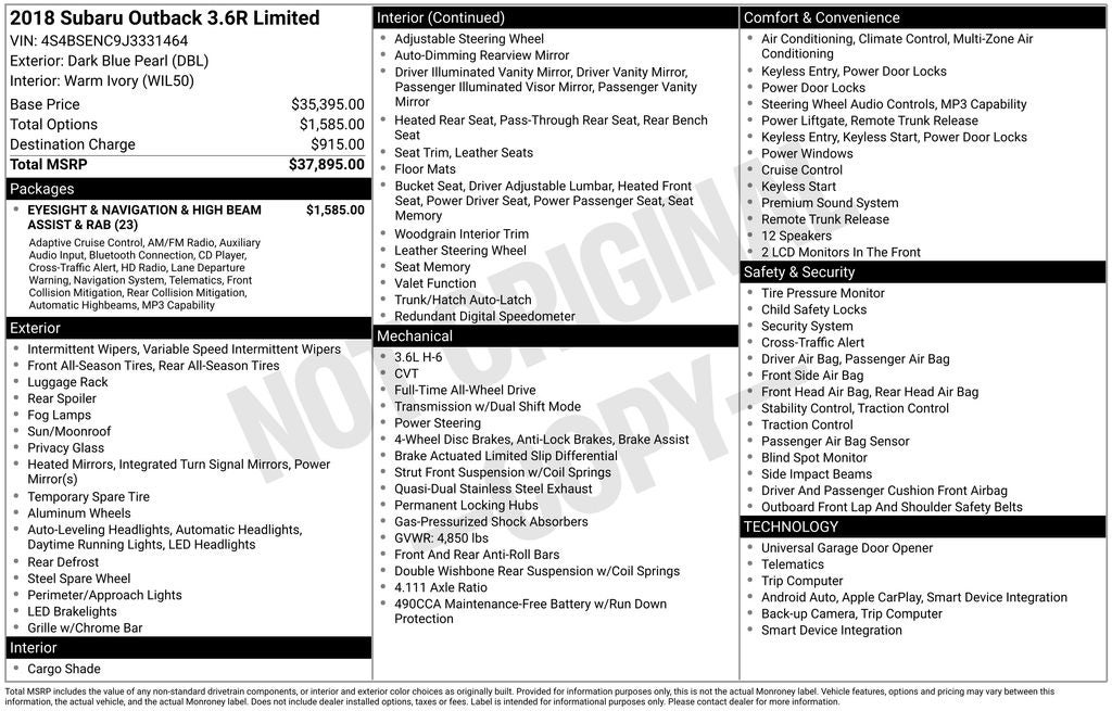 ** EYESIGHT ** NAVIGATION ** 2018 Subaru Outback Dark Blue Pearl 3.6R Limited AWD CVT Lineartronic 3.6L Boxer H6 DOHC 24V Air Conditioning, EyeSight & Navigation & High Beam Assist & RAB, Front Bucket Seats, Front dual zone A/C, harman/kardon Surround Sound Speaker System, Heated Reclining Front Bucket Seats, High Beam Assist (HBA), Memory seat, Navigation System, Perforated Leather-Trimmed Upholstery, Power driver seat, Power Liftgate, Power moonroof, Power passenger seat, Radio: Subaru STARLINK 8.0 Multimedia Nav System, Remote keyless entry, Reverse Automatic Braking (RAB), Smartphone Integration, Speed control, Vehicle Information Display, Wheels: 18 x 7.0 Aluminum Alloy w/Machine Finish. Recent Arrival! Odometer is 4732 miles below market average! 20/27 City/Highway MPG Awards: * ALG Residual Value Awards, Residual Value Awards * 2018 KBB.com Best Family Cars * 2018 KBB.com 10 Best All-Wheel-Drive Vehicles Under $25,000 * 2018 KBB.com 10 Most Awarded Brands * 2018 KBB.com Brand Image Awards ** You will love our NO HAGGLE, NO HASSLE PRICING here at Fitzgerald Auto Mall. Ask us about our BUYER PROTECTION PLAN, LOANER CAR PROGRAMS, AND FREE Vehicle History Report ** COMES WITH A WRITTEN FITZWAY CHECKOUT COVERING ALL MAJOR ITEMS! No Added Market Adjustments or Hidden Fees! Transparency You Can Trust, That's The FitzWay! Transparency You Can Trust.