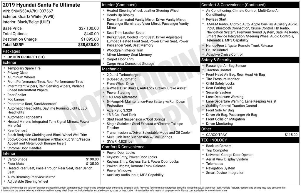 ** NAVIGATION ** POWER LIFTGATE ** POWER MOONROOF ** NEW TIRES ** Quartz White 2019 Hyundai Santa Fe Ultimate FWD 8-Speed Automatic with SHIFTRONIC 2.0L Turbocharged Beige Leather, 12 Speakers, Apple CarPlay & Android Auto, Auto High-beam Headlights, Exterior Parking Camera Rear, Front dual zone A/C, Heads-Up Display, Leather Seating Surface, Memory seat, Display Audio, Rain sensing wipers, Rear Parking Sensors, Wheels: 19 x 7.5J Alloy. COMES WITH A WRITTEN FITZWAY CHECKOUT COVERING ALL MAJOR ITEMS! ALL FITZGERALD PRICES ARE REAL PRICES WITH NO SNEAKY PRICE CONDITIONS OR ADDITIONAL RECONDITIONING OR CERTIFICATION CHARGES! THE BEST GUARANTEE IN THE ENTIRE COUNTRY! DON'T PAY FOR A MISTAKE SOMEWHERE ELSE! Please visit us at Fitzgerald Used Cars Clearwater between NE Coachman and Sunset Point RD on the north bound service rd. At 23499 US 19 N, Clearwater FL 33765. OR Contact a Sales Associate 727-799-1999. Transparency You Can Trust. That's the Fitzway!