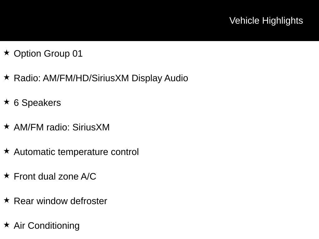 - Radio: AM/FM/HD/SiriusXM Display Audio -inc: 7-inch high resolution touchscreen, 6 speakers, Apple CarPlay & Android Auto, Bluetooth® hands-free phone system w/voice recognition and audio streaming, iPod/USB/MP3 auxiliary input jacks and speed-sensitive automatic volume control