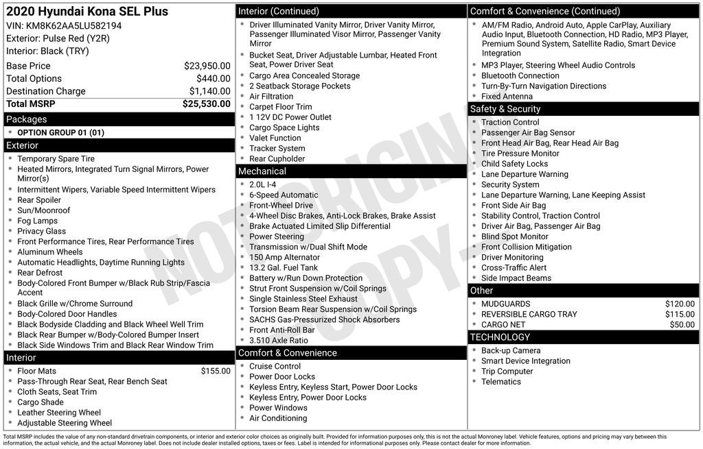 ** ONE OWNER ** 2020 Hyundai Kona Pulse Red SEL Plus FWD 6-Speed Automatic with Shiftronic I4 Air Conditioning, Apple CarPlay & Android Auto, Exterior Parking Camera Rear, Front fog lights, Heated Front Bucket Seats, Outside temperature display, Power driver seat, Power moonroof, Radio: AM/FM/MP3/HD Radio/SiriusXM Audio System, Remote keyless entry, Speed control, Turn signal indicator mirrors, Wheels: 17 x 7.0J Alloy.