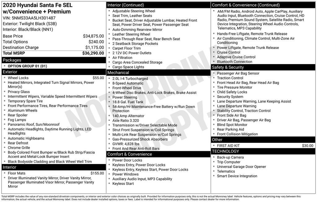** ONE ONE ** PANORAMIC SUNROOF ** LEATHER ** 2020 Hyundai Santa Fe Twilight Black SEL FWD 8-Speed Automatic with SHIFTRONIC 2.0L Turbocharged Black/Black w/Leather Seating Surface, Air Conditioning, AM/FM radio: SiriusXM, Apple CarPlay & Android Auto, Auto-dimming Rear-View mirror, Emergency communication system, Exterior Parking Camera Rear, Front dual zone A/C, Front fog lights, Garage door transmitter: HomeLink, Heated Front Bucket Seats, Leather Seating Surface, Low tire pressure warning, Outside temperature display, Power driver seat, Power Liftgate, Power moonroof, Power passenger seat, Radio: Infinity Premium AM/FM/MP3 Display Audio, Remote keyless entry, Speed control, Wheels: 19 x 7.5J Alloy. Recent Arrival! 20/27 City/Highway MPG ** You will love our NO HAGGLE, NO HASSLE PRICING here at Fitzgerald Auto Mall. Ask us about our BUYER PROTECTION PLAN, LOANER CAR PROGRAMS, AND FREE Vehicle History Report ** COMES WITH A WRITTEN FITZWAY CHECKOUT COVERING ALL MAJOR ITEMS! No Added Market Adjustments or Hidden Fees! Transparency You Can Trust, That's The FitzWay! Transparency You Can Trust.