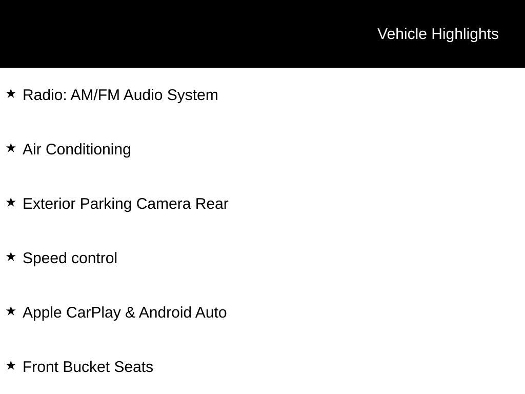 - Radio: AM/FM Audio System -inc: 7" color touchscreen display audio, Apple CarPlay, Android Auto, 6 speakers, USB/AUX input jack, Bluetooth® hands-free phone system