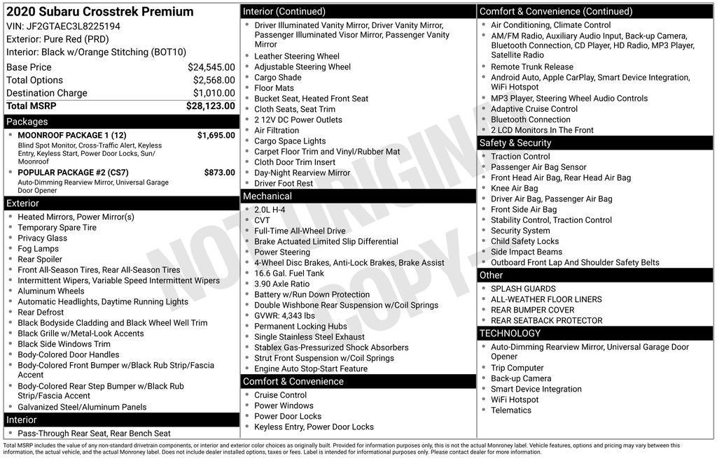 2020 Subaru Crosstrek Pure Red Premium AWD Lineartronic CVT 2.0L DOHC 6 Speakers, Active Cruise Control, Alloy wheels, AM/FM radio: SiriusXM, Automatic temperature control, CD player, Driver vanity mirror, Emergency communication system: STARLINK Safety and Security (Subscription Required), Exterior Parking Camera Rear, Front anti-roll bar, Front fog lights, Fully automatic headlights, Heated Front Bucket Seats, Knee airbag, Outside temperature display, Panic alarm, Passenger vanity mirror, Radio: Subaru Starlink 6.5 Multimedia Plus System, Rear anti-roll bar, Rear window defroster, Rear window wiper, Remote keyless entry, Security system, STARLINK/Apple CarPlay/Android Auto, Steering wheel mounted audio controls, Subaru Starlink Smartphone Integration, Telescoping steering wheel, Tilt steering wheel, Variably intermittent wipers.