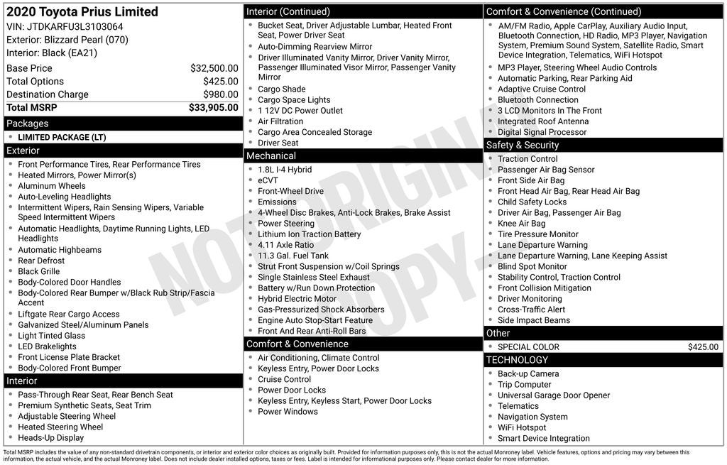** ONE OWNER ** NAVIGATION ** 2020 Toyota Prius Blizzard Pearl Limited FWD CVT 1.8L 4-Cylinder DOHC 16V VVT-i 1.8L 4-Cylinder DOHC 16V VVT-i, 10 Speakers, Adaptive Front Lighting System, Air Conditioning, Alloy wheels, AM/FM radio: SiriusXM, Apple CarPlay, Auto-dimming Rear-View mirror, Automatic temperature control, Color Head-Up Display (HUD), Driver vanity mirror, Exterior Parking Camera Rear, Front anti-roll bar, Heated Front Bucket Seats, Heated steering wheel, Knee airbag, Limited Package, Panic alarm, Power driver seat, Rain sensing wipers, Rear anti-roll bar, Rear window defroster, Rear window wiper, Remote keyless entry, SofTex Seat Trim, Speed control, Steering wheel mounted audio controls, Telescoping steering wheel, Tilt steering wheel, Variably intermittent wipers.