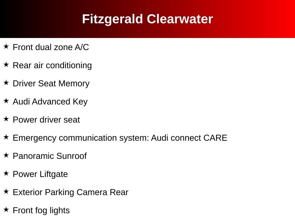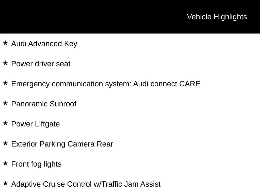 - Radio: Audi Sound System -inc: Audi smartphone interface w/wireless Apple CarPlay, preparation for mobile phone (Bluetooth®), MMI touch display w/10.1" center screen and 2 rear USB charge ports