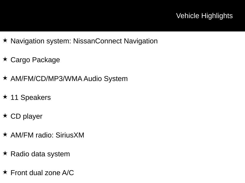 - Radio: AM/FM/CD/MP3/WMA Audio System -inc: Bose premium audio system w/11 speakers plus dual driver subwoofer, NissanConnect w/navigation featuring Apple CarPlay and Android Auto, Nissan door to door navigation w/3D building graphics and satellite imagery, connected navigation features including online POI search, door-to-door and online premium traffic information, SiriusXM Travel Link (weather, fuel prices, movie listings, stock info, sports and parking), SiriusXM Traffic, auxiliary audio input jack, SiriusXM satellite radio, A-IVI 8" display, 2 front illuminated USB connection ports (1 type-A, 1 type-C) for iPod interface and other compatible devices, Bluetooth® hands-free phone system, streaming audio via Bluetooth®, hands-free text-messaging assistant, Siri Eyes Free and 2 rear illuminated USB charge ports (1 type-A, 1 type-C)