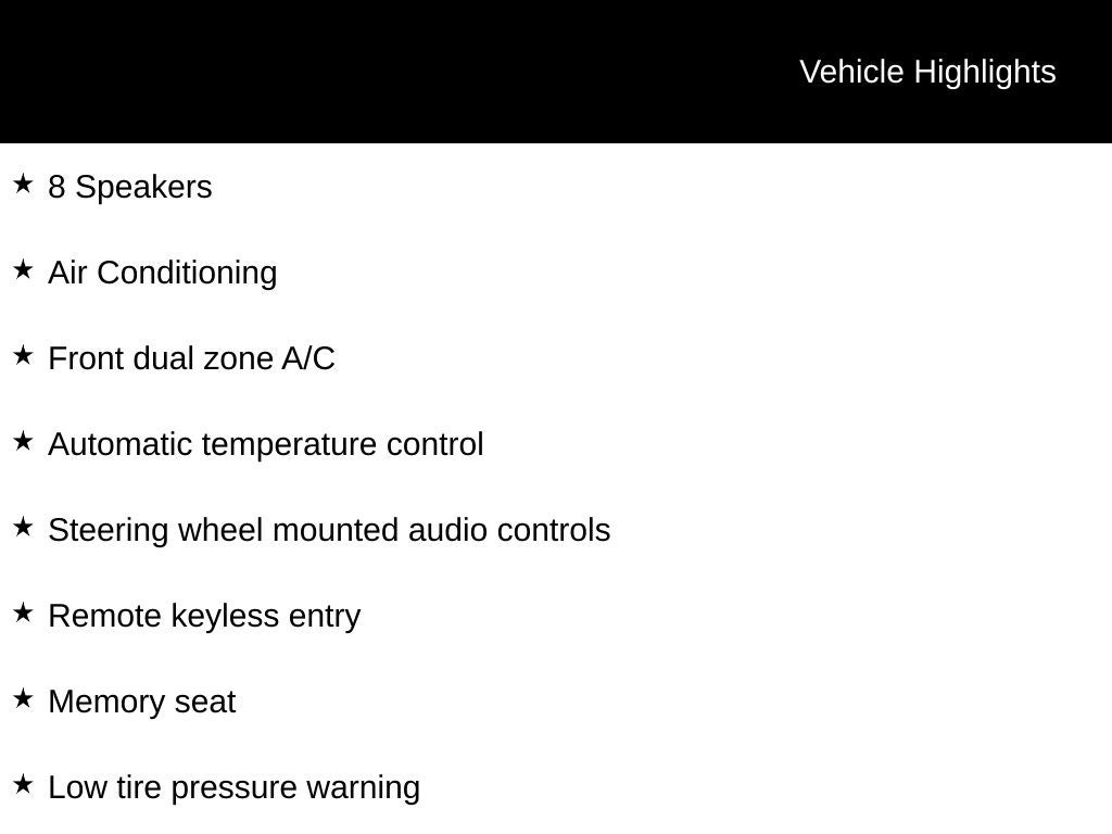 - Heated Front Bucket Seats -inc: adjustable front and rear headrests in all seating positions, 8-way power driver seat w/power lumbar support and driver seat memory