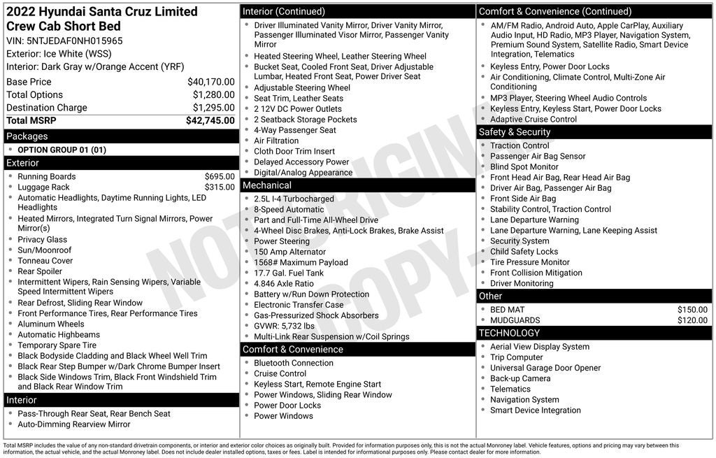 ** NAVIGATION ** 2022 Hyundai Santa Cruz Ice White Limited AWD Shiftronic 2.5L I4 4-Wheel Disc Brakes, 4.846 Axle Ratio, 8 Speakers, ABS brakes, Air Conditioning, Alloy wheels, AM/FM radio: SiriusXM, Apple CarPlay & Android Auto, Auto High-beam Headlights, Auto-dimming Rear-View mirror, Auto-leveling suspension, Automatic temperature control, Bed Mat, Brake assist, Bumpers: body-color, Cross Rails, Delay-off headlights, Driver door bin, Driver vanity mirror, Dual front impact airbags, Dual front side impact airbags, Electronic Stability Control, Emergency communication system: Blue Link Connected Car Service (3-year complimentary subscription), Exterior Parking Camera Rear, Four wheel independent suspension, Front anti-roll bar, Front Bucket Seats, Front Center Armrest, Front dual zone A/C, Front reading lights, Fully automatic headlights, Garage door transmitter: HomeLink, Heated & Ventilated Front Bucket Seats, Heated door mirrors, Heated front seats, Heated steering wheel, Illuminated entry, Leather Seat Trim, Leather Shift Knob, Low tire pressure warning, Mudguards, Navigation System, Occupant sensing airbag, Option Group 01, Outside temperature display, Overhead airbag, Overhead console, Panic alarm, Passenger door bin, Power door mirrors, Power driver seat, Power moonroof, Power steering, Power windows, Radio data system, Radio: AM/FM w/Bose Premium Audio System, Rain sensing wipers, Rear anti-roll bar, Rear step bumper, Rear window defroster, Remote keyless entry, Security system, Side Steps, Speed control, Speed-sensing steering, Split folding rear seat, Spoiler, Steering wheel mounted audio controls, Tachometer, Telescoping steering wheel, Tilt steering wheel, Traction control, Trip computer, Turn signal indicator mirrors, Variably intermittent wipers, Ventilated front seats, Wheels: 20 x 7.5J Alloy.