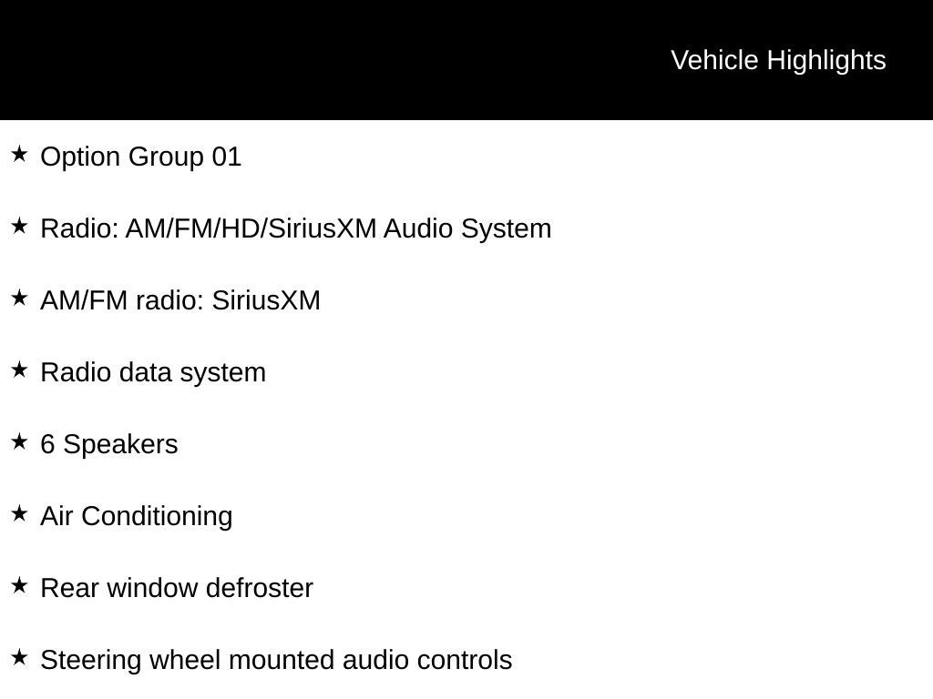 - Radio w/Seek-Scan, Clock, Speed Compensated Volume Control, Steering Wheel Controls, Voice Activation and Radio Data System
