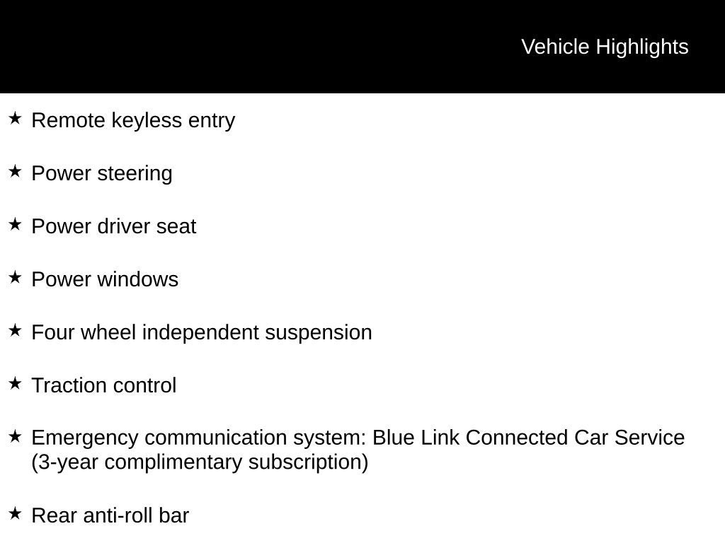 - Radio: AM/FM/HD/SiriusXM Audio System -inc: 8" color touchscreen display w/6 speakers, Blue Link connected car, Android Auto and Apple CarPlay, USB outlets and Bluetooth® w/voice recognition