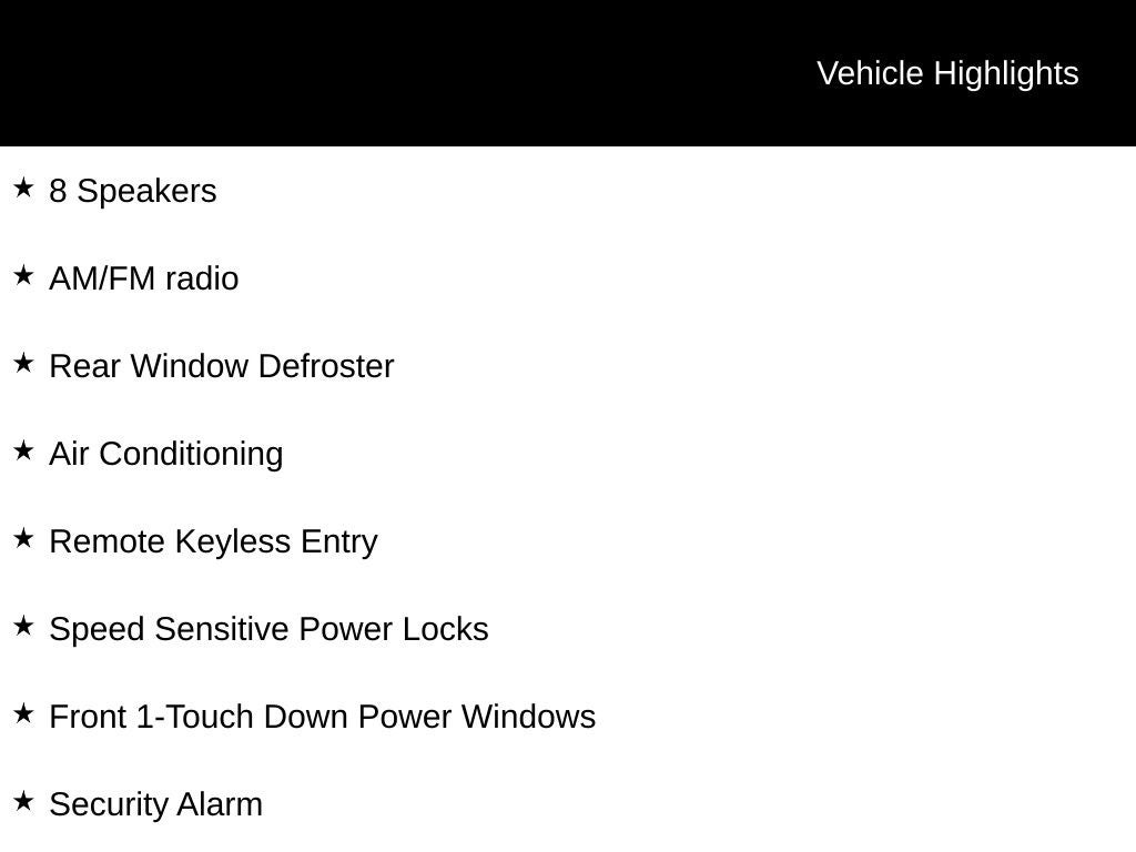- Radio w/Seek-Scan, Clock, Speed Compensated Volume Control, Aux Audio Input Jack, Steering Wheel Controls, Radio Data System and External Memory Control