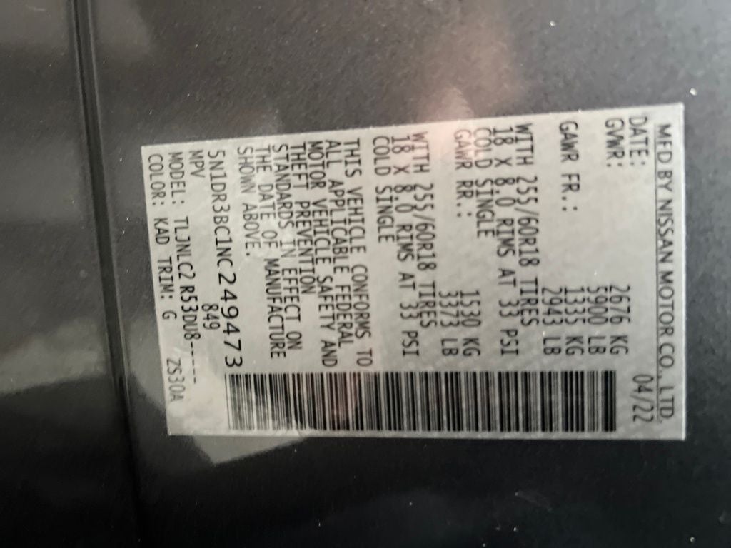 2022 Nissan Pathfinder Gun Metallic SV 4WD 9-Speed Automatic V6 4WD, 18 Painted Alloy Wheels, 3rd row seats: bench, 4-Wheel Disc Brakes, 6 Speakers, ABS brakes, Air Conditioning, Alloy wheels, AM/FM radio: SiriusXM, Auto High-beam Headlights, Automatic temperature control, Axle Ratio: TBD, Bench Seat Carpeted Floor Mats (Set of 4), Black Splash Guards (Set of 4), Brake assist, Bumpers: body-color, Cloth Seating Surfaces, Cross Bars, Delay-off headlights, Driver door bin, Driver vanity mirror, Dual front impact airbags, Dual front side impact airbags, Electronic Stability Control, Emergency communication system: NissanConnect Services, Four wheel independent suspension, Front anti-roll bar, Front Bucket Seats, Front Center Armrest, Front dual zone A/C, Front reading lights, Fully automatic headlights, Heated door mirrors, Heated Front Bucket Seats, Heated front seats, Illuminated entry, Knee airbag, Leather steering wheel, Low tire pressure warning, NissanConnect featuring Apple CarPlay and Android Auto, Occupant sensing airbag, Outside temperature display, Overhead airbag, Overhead console, Panic alarm, Passenger door bin, Passenger vanity mirror, Power door mirrors, Power driver seat, Power steering, Power windows, Radio data system, Radio: AM/FM Audio System w/NissanConnect, Rear air conditioning, Rear anti-roll bar, Rear Parking Sensors, Rear reading lights, Rear seat center armrest, Rear side impact airbag, Rear window defroster, Rear window wiper, Reclining 3rd row seat, Remote keyless entry, Security system, Speed control, Speed-sensing steering, Split folding rear seat, Spoiler, Steering wheel mounted audio controls, Tachometer, Telescoping steering wheel, Tilt steering wheel, Traction control, Trip computer, Turn signal indicator mirrors, Variably intermittent wipers.