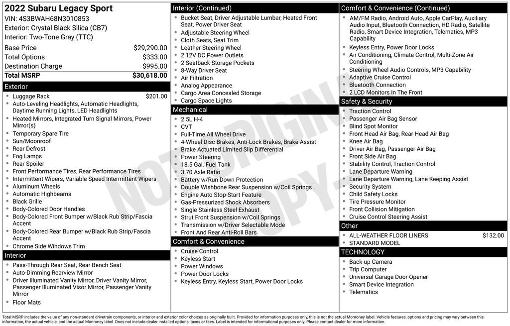 ** ONE OWNER ** Black 2022 Subaru Legacy 2.5i Sport Sport AWD Lineartronic CVT 2.5L 4-Cylinder DOHC 16V Exterior Parking Camera Rear, Front dual zone A/C, Heated Front Bucket Seats, Power driver seat, Power moonroof, Security system, Split folding rear seat, Spoiler, STARLINK/Apple CarPlay/Android Auto, Turn signal indicator mirrors, Wheels: 18 x 7.5J Aluminum-Alloy Black Finish. COMES WITH A WRITTEN FITZWAY CHECKOUT COVERING ALL MAJOR ITEMS! ALL FITZGERALD PRICES ARE REAL PRICES WITH NO SNEAKY PRICE CONDITIONS OR ADDITIONAL RECONDITIONING OR CERTIFICATION CHARGES! THE BEST GUARANTEE IN THE ENTIRE COUNTRY! DON'T PAY FOR A MISTAKE SOMEWHERE ELSE! Please visit us at Fitzgerald Used Cars Clearwater between NE Coachman and Sunset Point RD on the north bound service rd. At 23499 US 19 N, Clearwater FL 33765. OR Contact a Sales Associate 727-799-1999. Transparency You Can Trust. That's the Fitzway! Recent Arrival! 27/35 City/Highway MPG