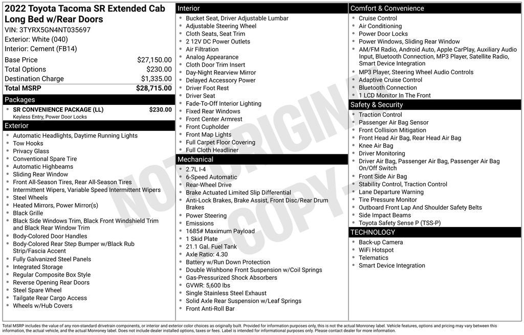 White 2022 Toyota Tacoma SR RWD 6-Speed Automatic 2.7L SMPI DOHC Air Conditioning, AM/FM radio: SiriusXM, Apple CarPlay/Android Auto, Exterior Parking Camera Rear, Front Bucket Seats, Remote Keyless Entry, Speed control, SR Convenience Package, Steering wheel mounted audio controls, Wheels: 16 x 7J Style Steel Disc.