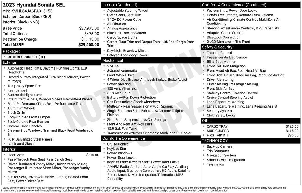 2023 Hyundai Sonata Carbon Blue SEL FWD 8-Speed Automatic with SHIFTRONIC 2.5L I4 Black Cloth, 17 x 7.0J Aluminum Alloy Wheels, 4-Wheel Disc Brakes, 6 Speakers, ABS brakes, Air Conditioning, Alloy wheels, AM/FM radio: SiriusXM, Apple CarPlay & Android Auto, Auto High-beam Headlights, Automatic temperature control, Brake assist, Bumpers: body-color, Cargo Tray, Carpeted Floor Mats, Delay-off headlights, Driver door bin, Driver vanity mirror, Dual front impact airbags, Dual front side impact airbags, Electronic Stability Control, Emergency communication system: Blue Link Connected Car Service (3-year complimentary subscription), Exterior Parking Camera Rear, First Aid Kit, Four wheel independent suspension, Front anti-roll bar, Front Bucket Seats, Front Center Armrest, Front dual zone A/C, Front reading lights, Fully automatic headlights, Heated door mirrors, Heated Front Bucket Seats, Heated front seats, Illuminated entry, Knee airbag, Low tire pressure warning, Mud Guards, Navigation System, Occupant sensing airbag, Option Group 01, Outside temperature display, Overhead airbag, Overhead console, Panic alarm, Passenger door bin, Passenger vanity mirror, Power door mirrors, Power driver seat, Power steering, Power windows, Premium Cloth Seating Surfaces, Radio data system, Radio: AM/FM/MP3/HD/SiriusXM Display Audio w/Nav, Rear anti-roll bar, Rear seat center armrest, Rear side impact airbag, Rear window defroster, Remote keyless entry, Security system, Speed control, Speed-sensing steering, Speed-Sensitive Wipers, Split folding rear seat, Steering wheel mounted audio controls, Tachometer, Telescoping steering wheel, Tilt steering wheel, Traction control, Trip computer, Turn signal indicator mirrors, Variably intermittent wipers.