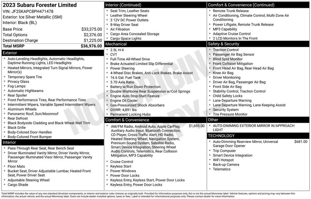 ** NAVIGATION ** 2023 Subaru Forester Ice Silver Metallic Limited AWD Lineartronic CVT 2.5L 4-Cylinder DOHC 16V 6 Speakers, Active Cruise Control, All-Weather Floor Liners, Alloy wheels, AM/FM radio: SiriusXM, Anti-whiplash front head restraints, Auto-Dimming Exterior Mirror w/Approach Light, Auto-Dimming Mirror w/Compass & HomeLink, Automatic temperature control, CD player, Driver vanity mirror, Exterior Parking Camera Rear, Front anti-roll bar, Front dual zone A/C, Front fog lights, Fully automatic headlights, harman/kardon 9-Speaker Audio System, Heated Front Bucket Seats, Heated Steering Wheel, Knee airbag, Leather Shift Knob, Low tire pressure warning, Nav & harman/kardon & RAB & Heated Steering Wheel, Navigation System, Outside temperature display, Panic alarm, Passenger vanity mirror, Perforated Leather-Trimmed Upholstery, Power Liftgate, Power moonroof: Panoramic, Radio: Subaru Starlink 8.0 Multimedia Nav System, Rear anti-roll bar, Rear window defroster, Rear window wiper, Remote keyless entry, Reverse Automatic Braking System (RAB), Security system, Speed control, Steering wheel mounted audio controls, Telescoping steering wheel, Tilt steering wheel, Turn signal indicator mirrors, Variably intermittent wipers. 26/33 City/Highway MPG ** You will love our NO HAGGLE, NO HASSLE PRICING here at Fitzgerald Auto Mall. Ask us about our BUYER PROTECTION PLAN, LOANER CAR PROGRAMS, AND FREE Vehicle History Report COMES WITH A WRITTEN FITZWAY CHECKOUT COVERING ALL MAJOR ITEMS! PROTECTED BY THE REMAINING BALANCE OF THE ORIGINAL FACTORY WARRANTY AND OUR 3 MONTH/4K MILE COMPREHENSIVE COVERAGE OF ALL MAJOR SYSTEMS AND COMPONENTS. WE OFFER A 10 DAY/500 MILE WRITTEN MONEY BACK GUARANTEE!! 30 DAY/1500 MILE EXCHANGE POLICY!! No Added Market Adjustments or Hidden Fees! Transparency You Can Trust, That's The FitzWay! Transparency You Can Trust.
