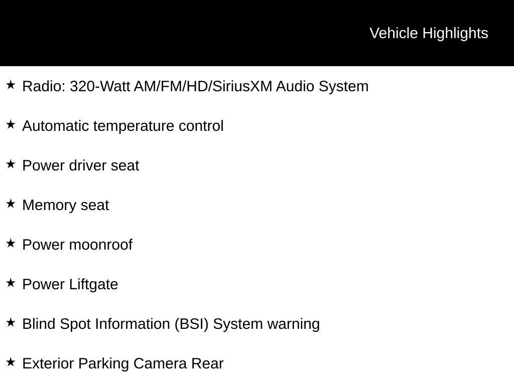- Radio: 320-Watt AM/FM/HD/SiriusXM Audio System -inc: 9" color touchscreen, 8 speakers, Apple CarPlay and Android Auto compatibility, wireless Apple CarPlay compatibility, wireless Android Auto compatibility, Bluetooth® streaming audio and USB-A 2.5A smartphone/audio interface in front seats, All SiriusXM services require a subscription, sold separately by SiriusXM after the trial period, If you decide to continue service, the plan you choose will automatically renew at the then-current rates, Fees and taxes apply, See the SiriusXM customer agreement and privacy policy at www.siriusxm.com for full terms and how to cancel, which includes calling 1-866-635-2349, Available in the 48 contiguous U.S, and D.C, Some services and features are subject to device capabilities and location restrictions, All fees, content and features are subject to change
