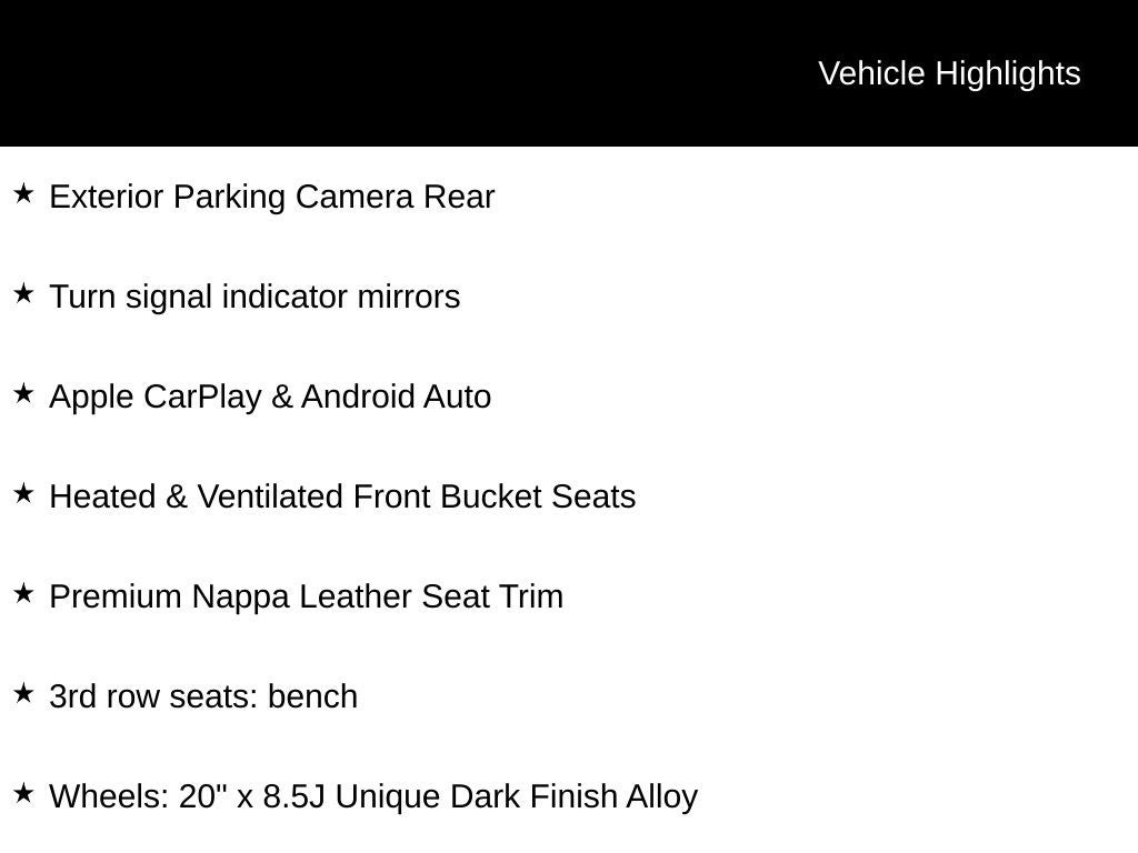- Wheels: 20" x 8.5J Unique Dark Finish Alloy