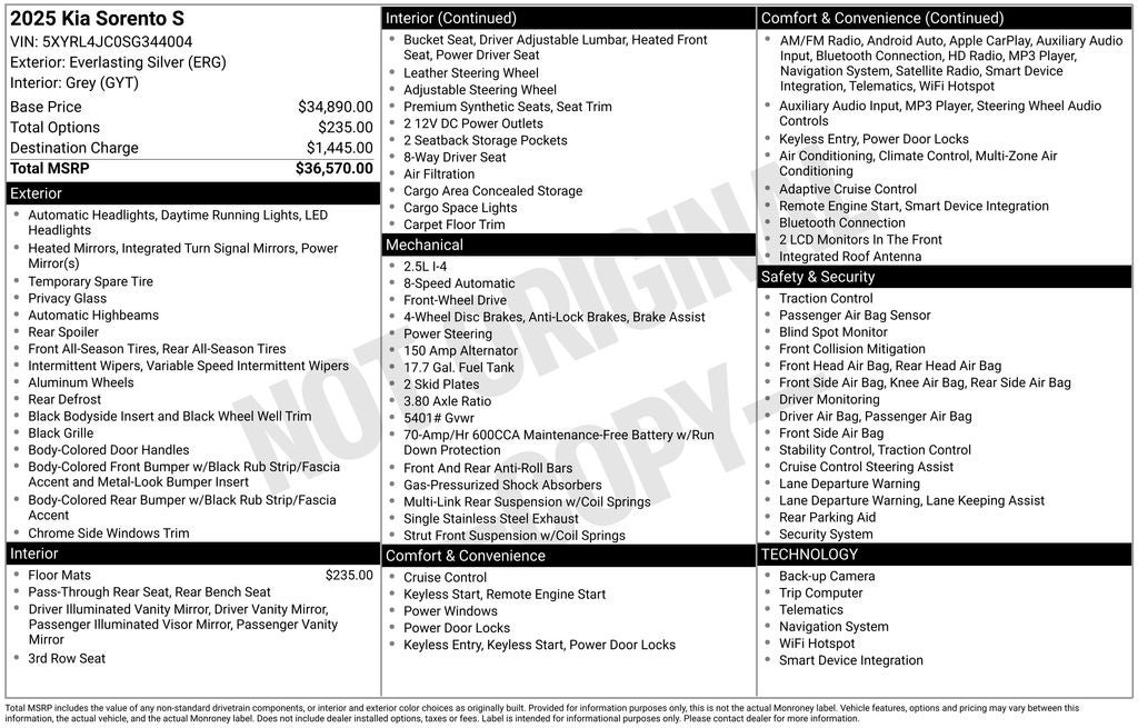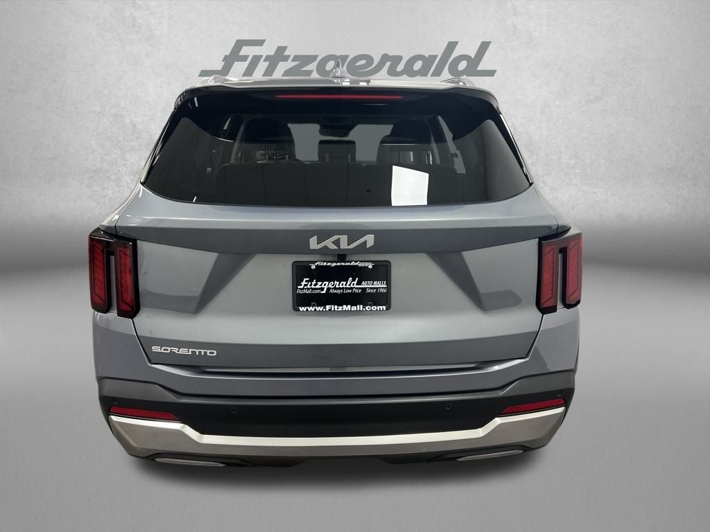 2025 Kia Sorento Everlasting Silver S FWD 8-Speed Automatic 2.5L I4 DGI DOHC 16V LEV3-SULEV30 191hp 3rd row seats: split-bench, 4-Wheel Disc Brakes, 6 Speakers, ABS brakes, Air Conditioning, Alloy wheels, AM/FM radio: SiriusXM, Apple CarPlay & Android Auto, Auto High-beam Headlights, Automatic temperature control, Brake assist, Bumpers: body-color, Carpeted Floor Mats, Delay-off headlights, Driver door bin, Driver vanity mirror, Dual front impact airbags, Dual front side impact airbags, Electronic Stability Control, Emergency communication system: 911 Connect, Exterior Parking Camera Rear, Four wheel independent suspension, Front anti-roll bar, Front Bucket Seats, Front Center Armrest, Front dual zone A/C, Front reading lights, Fully automatic headlights, Heated door mirrors, Heated Front Bucket Seats, Heated front seats, Illuminated entry, Knee airbag, Leather Shift Knob, Leather steering wheel, Low tire pressure warning, Navigation System, Occupant sensing airbag, Outside temperature display, Overhead airbag, Overhead console, Panic alarm, Passenger door bin, Passenger vanity mirror, Power door mirrors, Power driver seat, Power steering, Power windows, Radio data system, Radio: AM/FM Standard Sound System, Rear anti-roll bar, Rear reading lights, Rear side impact airbag, Rear window defroster, Rear window wiper, Remote keyless entry, Security system, Speed control, Speed-sensing steering, Split folding rear seat, Spoiler, Steering wheel mounted audio controls, SynTex Artificial Leather Seat Trim, Tachometer, Telescoping steering wheel, Tilt steering wheel, Traction control, Trip computer, Turn signal indicator mirrors, Variably intermittent wipers, Wheels: 18 Gloss Black Alloy.